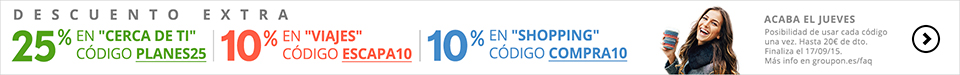 Sólo quería avisaros de que hasta mañana por la noche (23:59h del 17/09/2015) en Groupon tienen hasta un 25% de descuento en varias secciones.